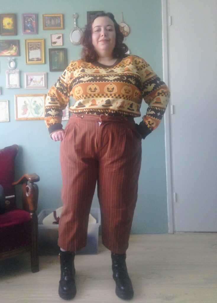 The trousers on this collection are made of the same 100% cotton twill, the pattern is a clasical 1940s men´s straight line trousers but adapted for women with ¨big behinds¨as I myself am. They´re super comfortable, it also has the shirring on the sides of the waistband so that it gives a crisp nice butt shape, and the cinchers band on both sides of the front closing are there not only for aesthetical purposes but also to make it slightly smaller if necessary. Plus: They have giant pockets! Notice though that the ones in the pictures I adapted the length to my personal tastes, and the production ones are regular length