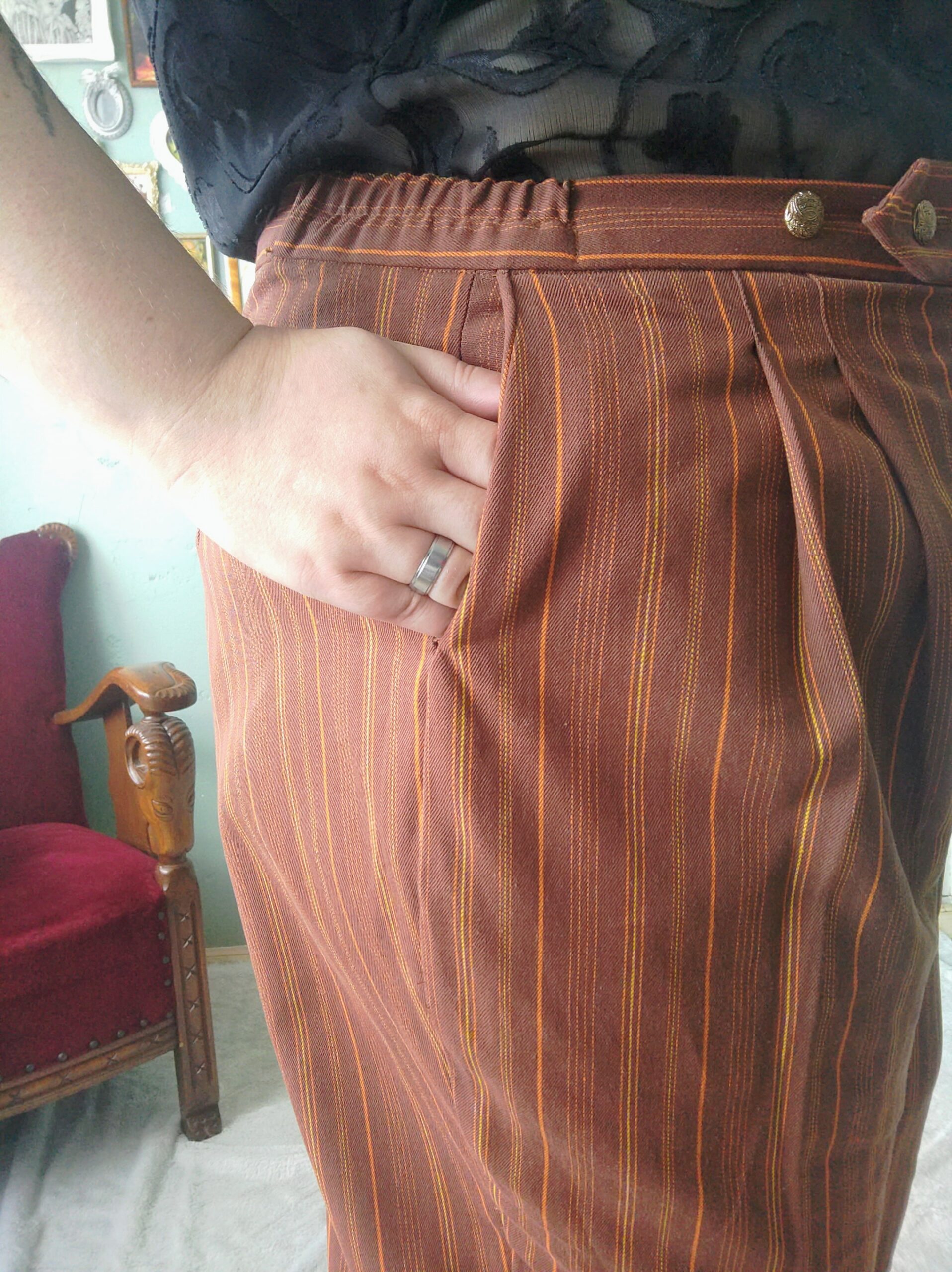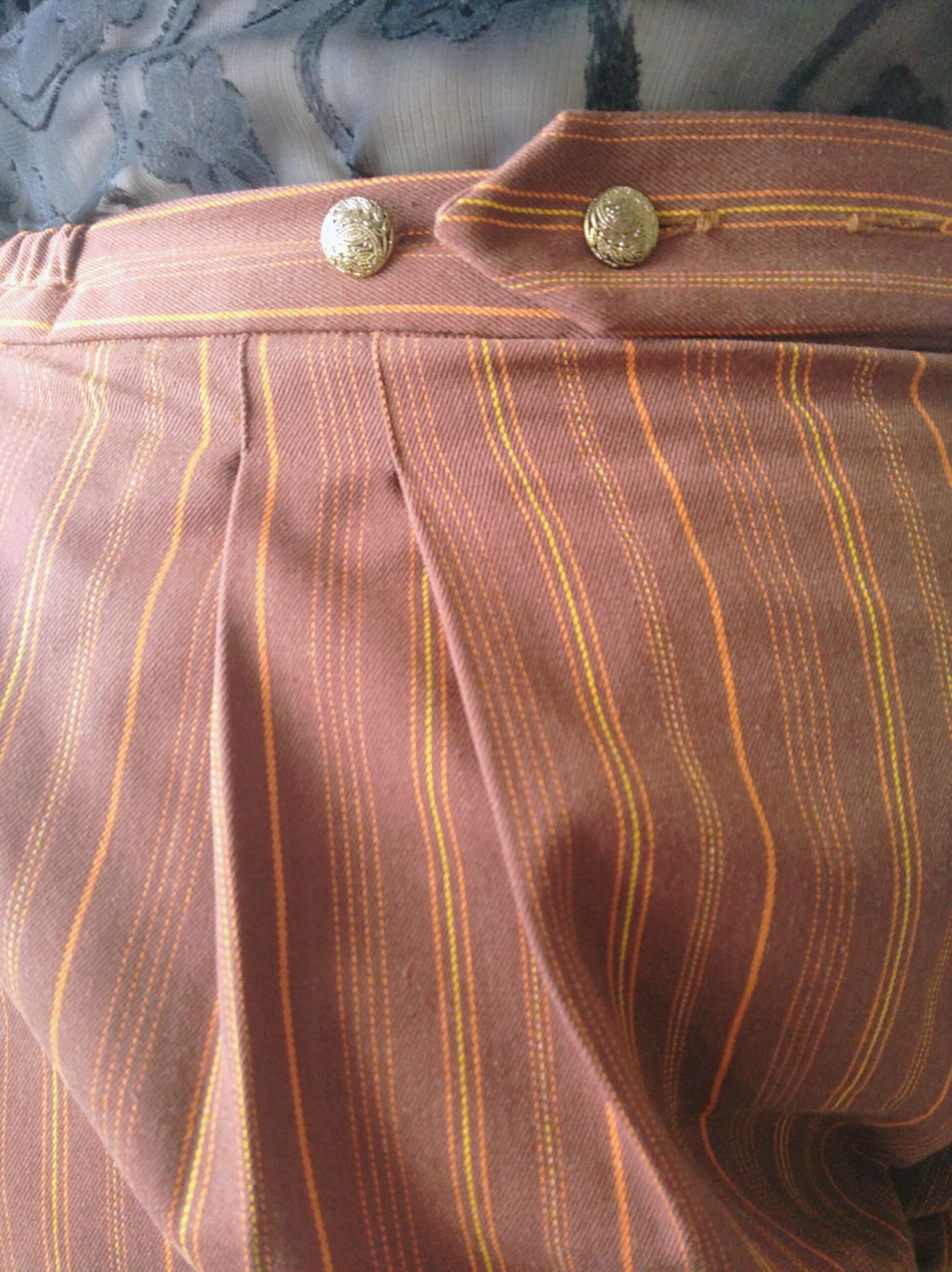 Made in cotton twill, they´re sturdy but breathable, the pinstripe and colour also reminisces from 1970´s fashion; all is completed with deep pockets, a partially elastic waistband and cincher belts on the front to make them smaller if necessary, complimented with two beautiful retro looking buttons